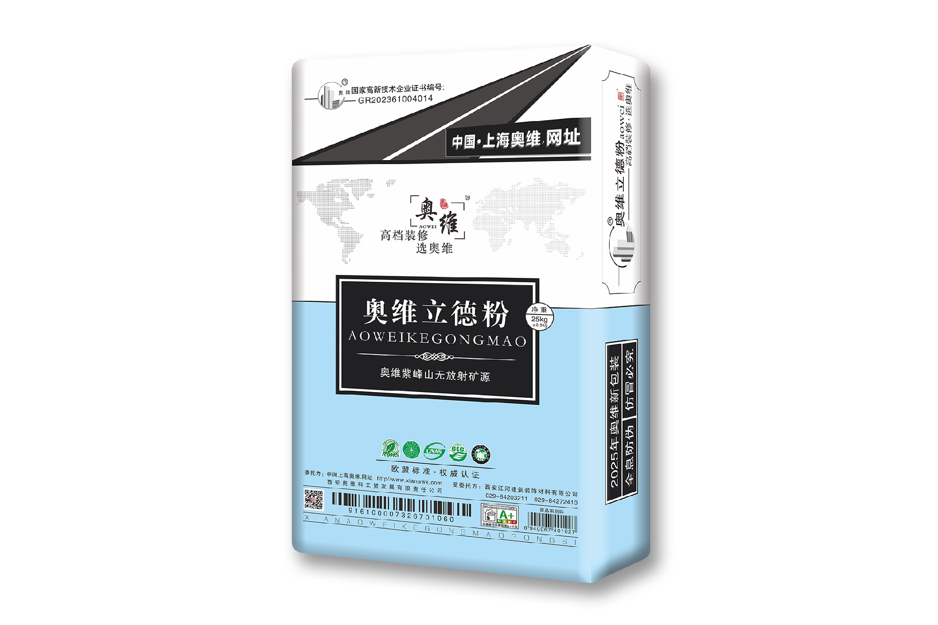 奥维立德粉》属于原料类商品,用于生产建材产品及施工时,由于施工环境、施工基面、施工工艺、施工流程、施工技术及各种材料的混合及配比都会对施工质量产生直接影响,任何一个环节失当均可导致最终的工程质量问题。在此,奥维公司郑重声明:奥维公司是行业内**一家**《高新技术企业》(证书编号:GR202361004014),我公司生产的《奥维立德粉》从原材料到产成品均在严苛的品控管理下制成,符合国标GB/6566-2010标准(放射性核素国家标准),并通过了ISO14001-2015**环境体系、ISO9001-2015**质量体系、法国A+及环保绿色标志等多项**外权威机构认证。